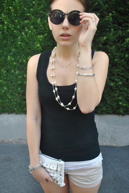 Ciao Amici! L’altro giorno, durante un pomeriggio di shopping, sono apparsi loro….questi fantastici occhiali neri! Adoro il modello e ho deciso, per il look di ieri, di abbinarli ad un paio di shorts, una maxi collana e una pochetta bianca con dei dettagli dorati….ecco il risultato finale!:D