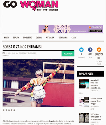 Ecco Amici il quinto appuntamento con GO WOMAN, il magazine on line per qui scrivo oramai da qualche mese….l’argomento di oggi è lo zaino,must di questo autunno-inverno!Personalmente non amo per nulla gli zaini,non li trovo per nulla femminili!Voi invece cosa ne pensate??? Nell’articolo troverete alcuni esempi 🙂Per leggere tutto l’articolo…